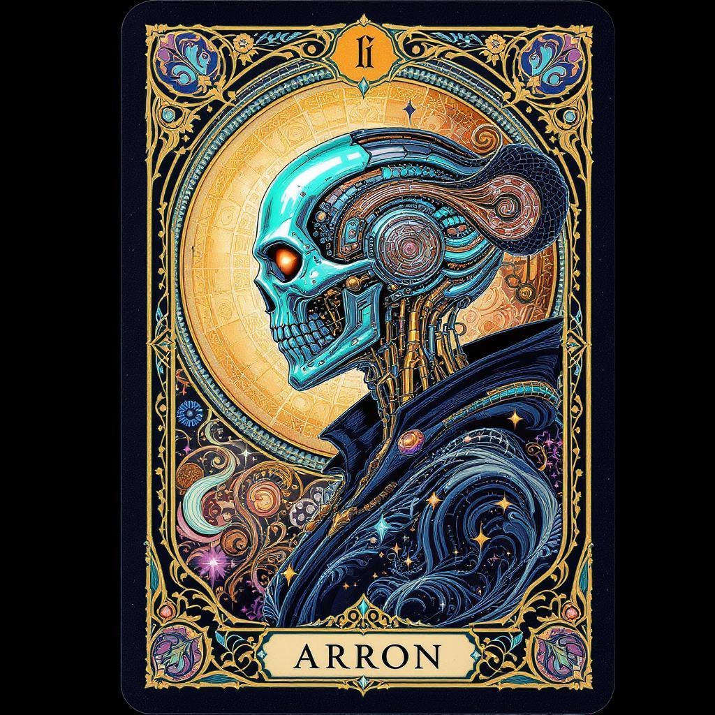 Tarot card featuring an exquisitely detailed frame, showcasing the side profile of a cyberpunk figure with a cyborg skull; infused with Art Nouveau elements, the design is richly intricate and adorned with embellishments. This high-definition concept art presents vibrant colors, merging cyberpunk aesthetics with ornate, flowing patterns, capturing a fusion of futuristic technology and elegant artistry.