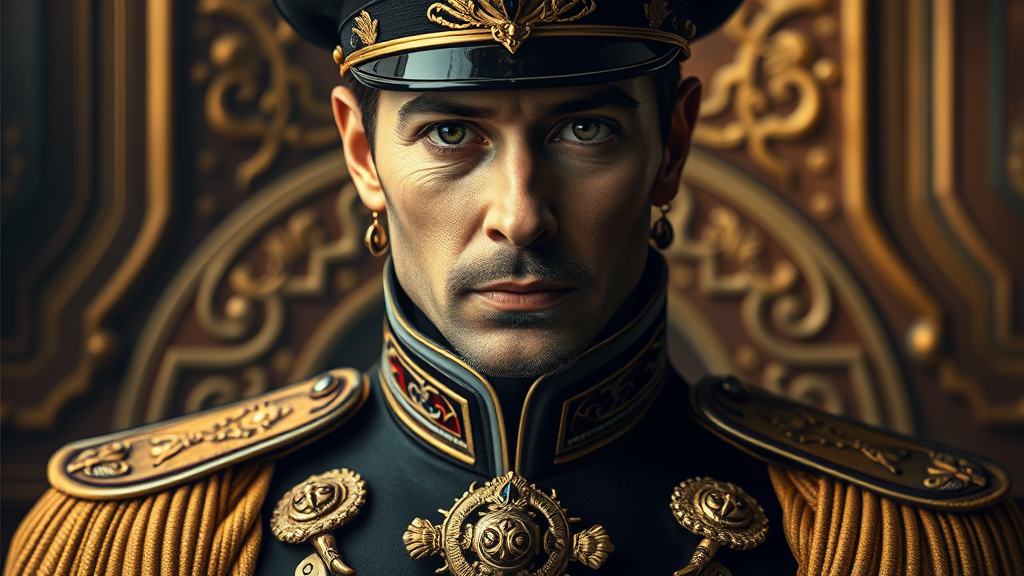 Portrait of Paul Atreides in a majestic Royal Military Uniform, showcasing an elegant and realistic depiction. The image is richly detailed and ornate, embodying a Sci-Fi essence with UHD, HDR, and 8K quality. The style is inspired by the Dark Sushi Mix - Colorful model. Avoid duplications or disfigurements, ensuring a well-proportioned and harmonious appearance. The portrait should highlight striking eyes and a noble presence, avoiding any exaggerated features or abnormalities. The composition should be clear and in focus, free from any artifacts, text, or logos, maintaining a sharp and cohesive visual.