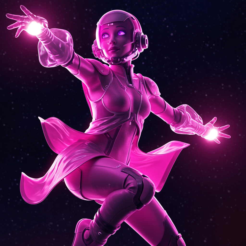 A high-resolution image captures the essence of a dynamic character in a futuristic setting: a shining AI with a human-like face. The character wears a sleek metal suit and helmet, poised energetically with flowing garments that suggest motion. The vivid color scheme incorporates pink and reflective silvers, reminiscent of nightcore aesthetics, enhanced by dramatic backlighting to emulate a neon glow against a darker cosmic backdrop. Bright and luminescent, the composition features a sharp focus on the character with a blurred background, realistic textures accentuating the clothing and hair. A visible light source in her hands produces a gleaming, otherworldly effect. She has striking purple eyes and is depicted in a leaping pose, reaching out and gazing upward. Captured with a GoPro HERO10 Black and Cinestill 800T film style, this cinematic, cyberpunk-inspired scene resembles a candid snapshot, capturing a spontaneous moment of action in a surreal sci-fi universe. The character's gesture and gaze convey depth and intrigue.
