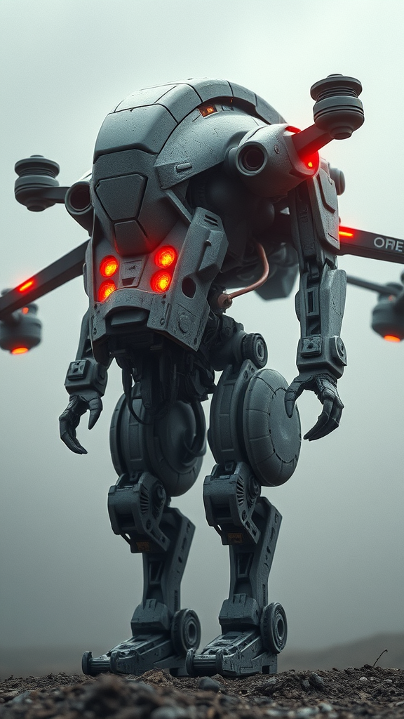 Futuristic SciFi drone robot MACHINE BUMPER, featuring a full-body design with a cinematic and intense composition. The scene is drenched in dramatic lighting and expertly crafted color grading. The robot, inspired by poorly drawn cathedrals, showcases mutated, distorted, and deformed features, presenting an ugly and disfigured appearance. The anatomy appears abstract and surreal, evoking a sense of baroque art with elements reminiscent of a Manet painting. The overall aesthetic blends cartoonish sketches with a blur of abstract forms, resulting in a uniquely captivating yet unsettling vision.
