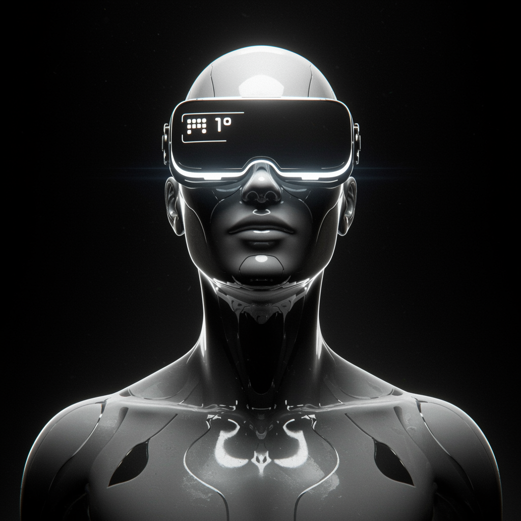 A futuristic portrait features a sleek, metallic male cyborg with gleaming silver skin, seamlessly integrated high-tech VR goggles replace his eyes. The robotic figure exudes a radiant, reflective luminosity against a shadowy, enigmatic backdrop, giving the illusion of levitation, as if defying gravity.