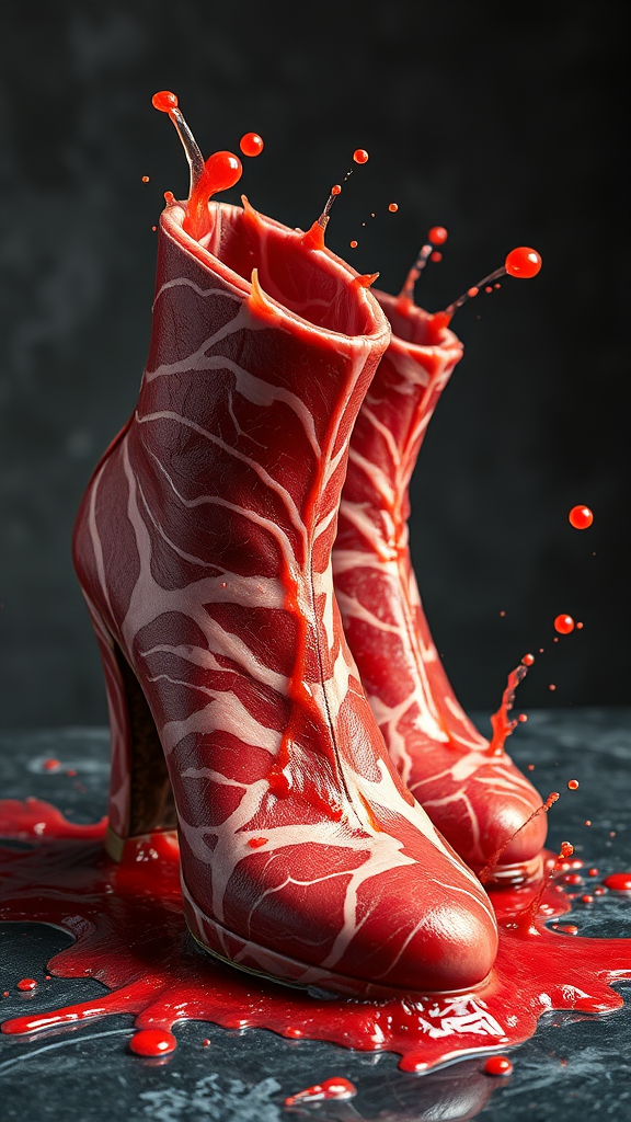 A pair of fantastical raw meat shoes crafted from opulent slabs of marbled beef, glistening with vibrant hues and elegantly arranged in a dynamic, eye-catching fashion, reminiscent of avant-garde food product photography. These unique footwear pieces combine the organic texture of meat with an abstract, splashy aesthetic, blending the surrealism of fashion and gastronomy into an exquisite work of art.