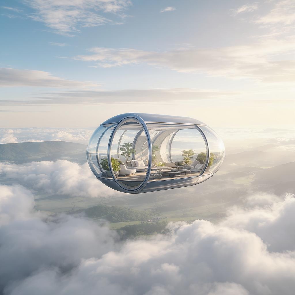 The capsule house hovers gracefully in the air, suspended among wispy clouds, casting playful shadows on the vibrant landscape below. Soft beams of sunlight filter through translucent walls, creating a serene and tranquil ambiance within the ethereal abode. The structure gently sways with the breeze, offering its inhabitants breathtaking panoramic views of the rolling hills and lush valleys stretching far beneath, a surreal sanctuary floating in the sky.