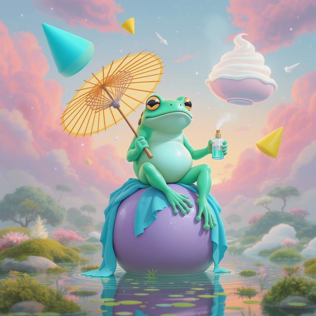 A whimsical scene unfolds with a large, teal anthropomorphic frog wearing a serene expression as it perches on a lavender ball draped in a cerulean cloth. In one hand, the frog gracefully holds a sunburst-yellow parasol, while the other clutches a delicate misting bottle. Surrounding the frog, a constellation of abstract shapes hovers—turquoise and lemon-yellow cones mingle with a floating bowl swirling with soft, marshmallow-like foam. The backdrop is a candy-colored sky, bathed in the gentle hues of dawn, with blush and periwinkle-tinted clouds drifting lazily by. Below, the ground is a dreamy, verdant oasis, where tufts of moss and clusters of tiny water plants bob gently in the water. The scene exudes a playful magic, softened by ethereal lighting and an imaginative, surreal atmosphere.