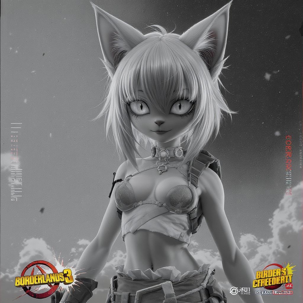 Cute cat girl, inspired by Yoji Shinkawa and Guweiz, designed with elements reminiscent of the Borderlands aesthetic, rendered using Unreal Engine and Octane Render, featuring depth of field, 8k UHD clarity, raytracing, and cinematic lighting. The image embraces a monochrome, grayscale palette and includes an artistic touch reminiscent of text, logo, and watermark styles. Though slightly cropped and out of frame, it maintains a dynamic visual. The design explores both high and low resolutions, where subtle jpeg artifacts and blur create a sense of texture. Anatomy features slight exaggerations with a surreal twist, such as elongated features or abstract proportions, embodying a stylized artistic expression.