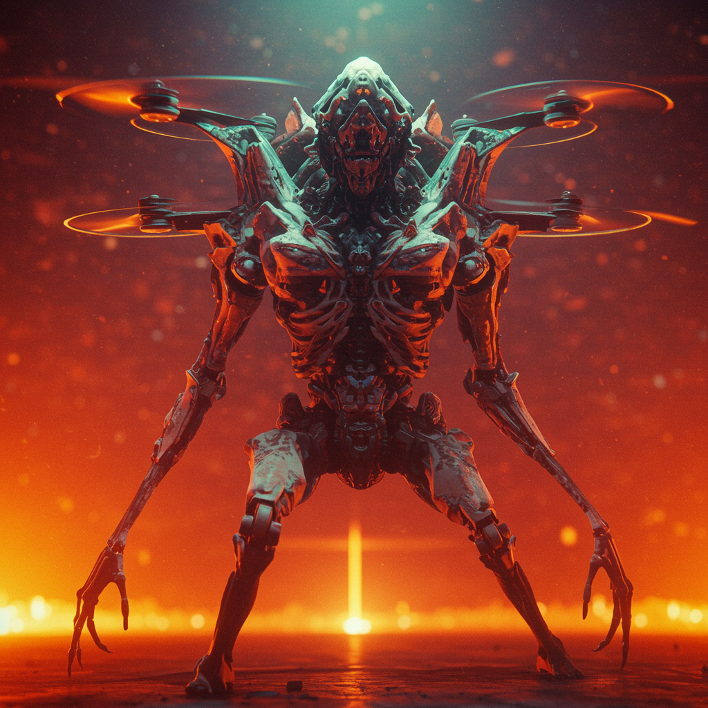 Futuristic sci-fi drone robot in a cinematic scene, featuring an intense and dramatic composition with hdr lighting. The robot, a fusion of machine and artistic abstraction, embodies a poorly drawn and mutated cathedral-like figure, with deformed, disfigured, and distorted features. Despite its grotesque and ugly appearance, with wrong anatomy and blurry details, the design captivates with a baroque and Manet-inspired influence. The scene is enveloped in a vibrant color grade, creating a dynamic yet chaotic setting that contrasts with the robot's cartoonish and sketch-like qualities, echoing a world of abstract and low-quality aesthetics.