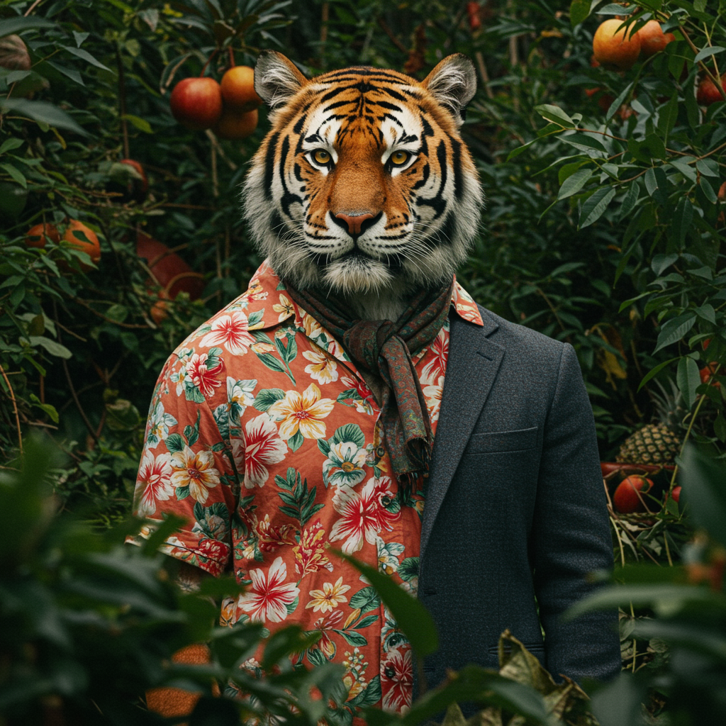 A majestic tiger stands regally in a lush jungle setting, clad in a vibrant Hawaiian floral shirt, a stylish jacket, and a cozy scarf. Surrounding the tiger are dense, verdant plants and leaves, creating a natural backdrop teeming with life. Beside the tiger, a man wearing a tailored jacket complements the scene, evoking the artistic touch of Christian W. Staudinger. The composition resembles a striking album cover, embracing maximalism with an imaginative twist. The tiger's eyes, detailed and striking, reflect remarkable color and texture, enhanced by a touch of bold eyeliner. The scenery bears a fking_scifi vibe, channeling the whimsical style of L. Frank Baum, set against a backdrop bursting with colorful fruits. Captured in a panoramic view, the image evokes the feel of raw candid cinema, utilizing 16mm cinematic camera techniques with Portra 400 film color grading. The result is an ultra-realistic portrayal where textured skin, detailed pupils, and subtle skin imperfections such as fuzz and dryness are clearly visible, creating an authentic, lifelike presence. Despite the whimsical elements, the scene maintains an underlying realism, steering clear of cartoonish or video game aesthetics, while avoiding bizarre proportions or digital manipulation artifacts.