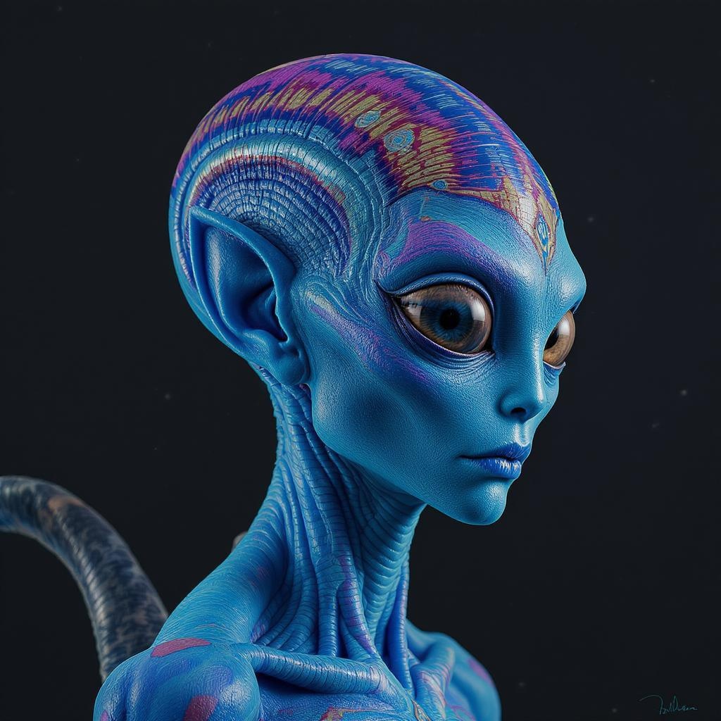 A captivating blue alien with a single large, expressive eye and oversized ears, sporting a vibrant array of wild colors. The portrait reveals an intricately detailed character, perfectly centered with a highly detailed and symmetrical face. The skin texture is extremely intricate, showcasing a blend of cinematic sci-fi and fantasy elements. The hyper-realistic, ultrarealistic features are highlighted by dramatic lighting, achieved through digital painting. The scene presents a masterpiece of digital art in sharp focus, ensuring every detail is visible in 8k quality. The alien's figure exudes an epic presence, with a lifelike depiction that includes a touch of creativity such as an unusual pattern on its skin or a unique expression. The artwork incorporates side profile aspects, maintaining intense detail while exploring imaginative characteristics that distinguish it from a typical portrayal.