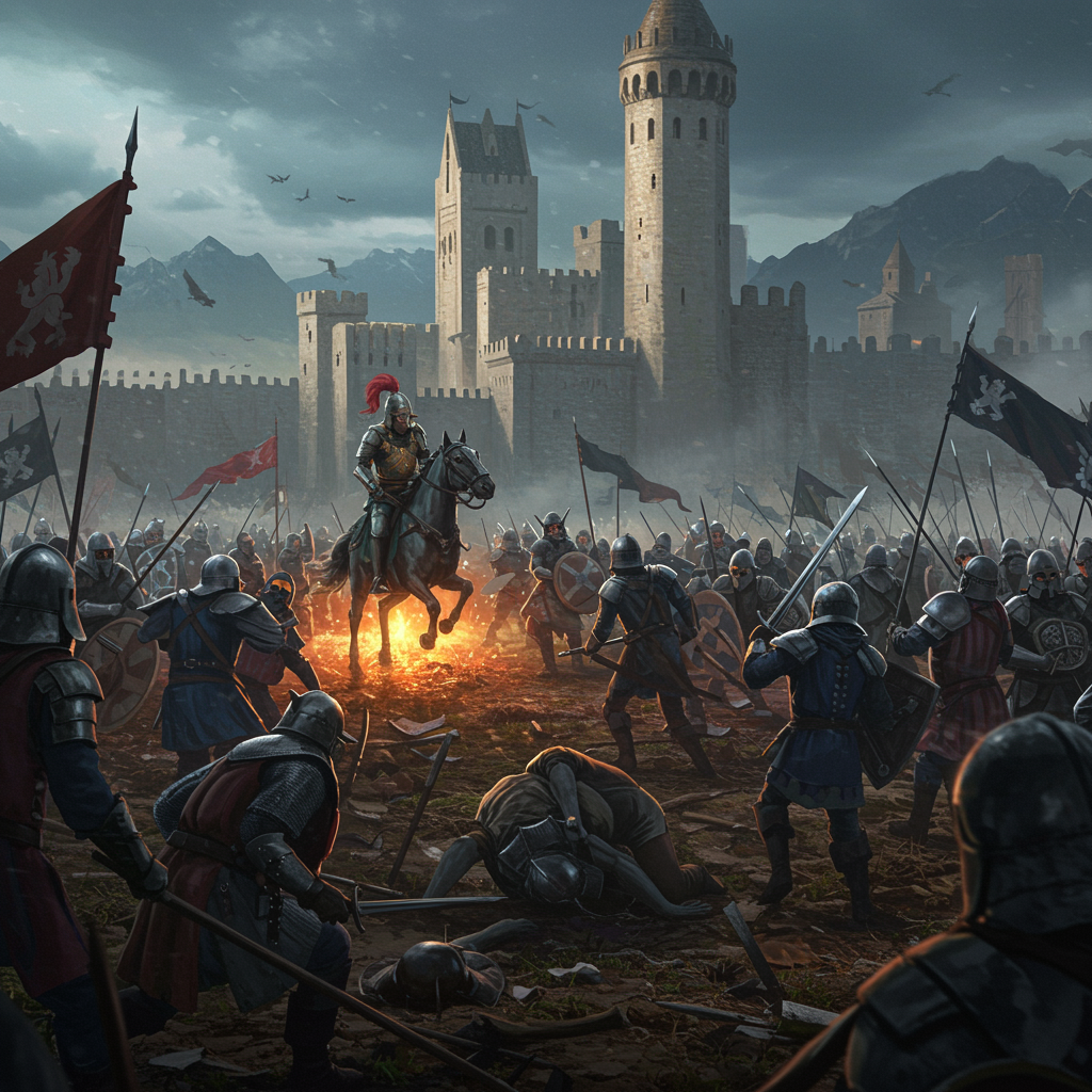 A vibrant and atmospheric scene of a medieval battlefield in a fantasy world, with hundreds of warriors engaged in warfare. The digital art is infused with glow effects, hand-drawn elements, and rendered in ultra-detailed 8k resolution. The environment is created using octane render and cinema 4d, with Blender employed for intricate modeling. The artwork carries a dark yet humorous tone, with sharp focus and vibrant colors achieving a cinematic, sensual quality. The scene captures a professional oil painting essence inspired by Ed Blinkey, Atey Ghailan, Studio Ghibli, Jeremy Mann, Greg Manchess, and Antonio Moro. This artistic masterpiece is trending on ArtStation and CGSociety, characterized by hyperrealism, vivid colors, and a modelshoot style. The concept art maintains high detail, capturing a dramatic and photorealistic ambiance reminiscent of the works of Midjourney and Greg Rutkowski. Despite the fantastical elements, the composition maintains excellent anatomy and proportion, avoiding any undesirable mutations or distortions, with all characters and elements clearly in frame and well-rendered.