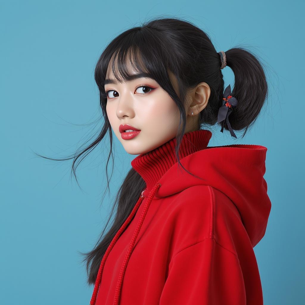 young woman, solo, flowing hair, crimson hoodie, cropped to midriff, gazing directly, azure backdrop, dark hair, minimalist background, toes visible, full lips with a seductive expression, decorative ribbon, tied hair ribbon, side-swept bangs, turtleneck design, upper body focus, partial side profile, soft turtleneck, striking blue eyes with bangs, ebony ribbon, textured hoodie, dual ponytails, defined nose, maintain high quality, flawless smooth skin, virtual 3D rendering