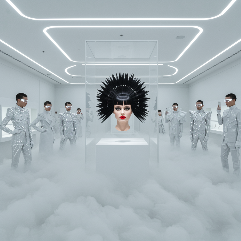 In a futuristic museum hall filled with a gentle, drifting mist, the entire space bathes in an overwhelmingly white palette, creating a disorienting sense of purity. The ceiling is adorned with continuous LED strips that stretch across its entirety, their glow partially absorbed by the swirling haze on the floor, producing an ethereal, soft lighting effect. The room lacks doors or windows, heightening the surreal and otherworldly ambiance. At the heart of the space stands a sleek glass display case. Inside, a mesmerizing, levitating female head is presented, featuring bold red lips, editorial-style makeup, dramatic contouring, and a shimmering metallic highlighter. Her extravagant, avant-garde wig, composed of textured black hair with a short fringe, is adorned with small metallic pins and sculpted into futuristic, architectural forms with intricate geometric patterns. The head appears suspended, sans body, with only the striking hair visible. Encircling the display, elegantly attired individuals in avant-garde, high-fashion futuristic clothing stand in admiration, capturing the spectacle with their smartphones. Their outfits showcase bold, sculptural silhouettes, reflective metallic fabrics, exaggerated shoulders, high-neck collars, and intricate laser-cut details, with asymmetrical designs. Some sport visor-like glasses, glowing accessories, and defy gravity with their structured garments. The bright flashes of their cameras create a captivating interplay of light against the glass. The scene exudes an eerie yet captivating surrealism, merging high fashion, advanced technology, and an aura of mystery, evoking a high-end fashion editorial feel from a distant future.