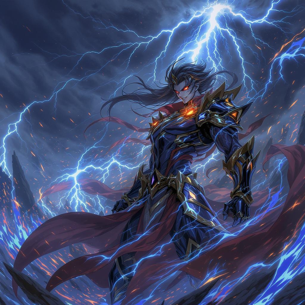 Anime-inspired digital illustration of a sorcerer humanoid male prince of darkness, victorious on the battlefield amidst a backdrop of blue infernal flames and sparks. The scene is set in an apocalyptic landscape with a vivid, colorful palette, capturing the intricate and elegant details of the battle. The air crackles with energy as a thunderstorm rages overhead, casting dramatic, hyper-detailed shadows and highlights. The image is rendered in stunning 8K resolution, emphasizing every scenic detail and the prince's commanding presence.