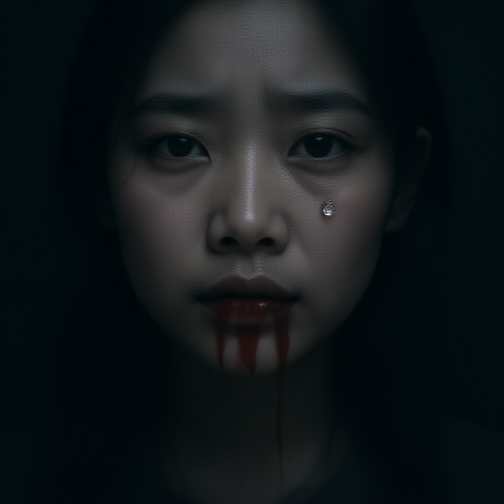 A haunting portrait of an Asian woman, her face marked by loss and desolation, as a single tear blends with the blood trailing from her chin. Her pain is intricately detailed, with raw emotion etched into her expression, capturing the horror of a young girl grappling with the daunting reality of forging her path alone. The muted palette of somber blues and greys, interwoven with deep shadows, envelops the scene, enhancing the atmosphere of sorrow. Subtle hints of light play across her features, highlighting the intricate textures of her skin and the glistening path of her tear, creating a gripping 4K visual.