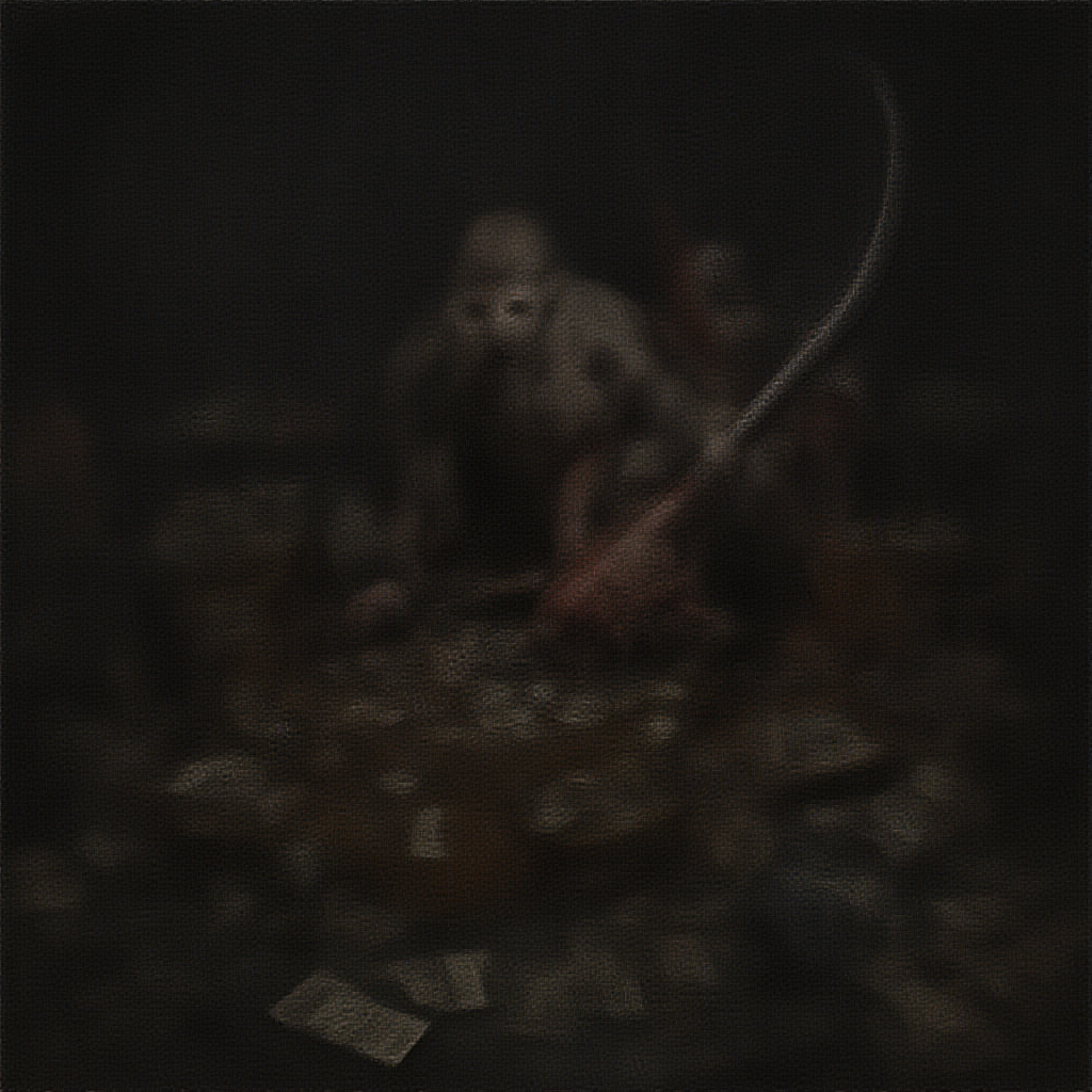 Death engaged in a poker game, the ominous scythe standing tall in the background, eyes fixed towards the viewer, surrounded by a clutter of poker tables, chips, cards, and cash. The atmosphere is eerie and unsettling, with CGI elements adding to the surreal feel. The image has low resolution and displays various imperfections: overlapping text, faded colors, and visible JPEG artifacts. The scene is chaotic, with distorted, duplicated features, and morbid details. The central figure has unnaturally elongated limbs, extra fingers, and a blurred, misshapen face. The anatomy is off, with disfigured proportions and limbs that donβt align correctly. Additional limbs appear randomly, and elements like a stretched neck and fused fingers add to the bizarre and unsettling imagery. A blurred watermark or signature appears partially visible, contributing to the overall messy and imperfect composition.