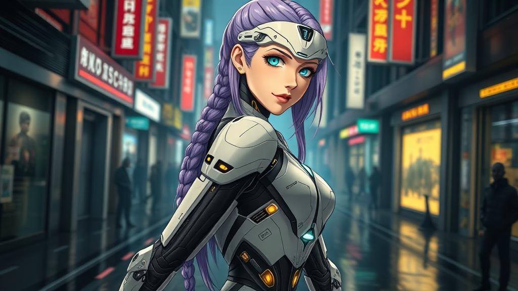 Ultra-detailed, anime style, solo female cyborg, long violet braided hair, luminous teal eyes, alabaster skin, athletic and curvaceous body, clad in a sleek futuristic armored bodysuit with ivory plating and ebony carbon fiber technology components, with joints accented in gold, radiant circuits tracing along her arms and spine, fully mechanical arms showcasing intricate articulation and embedded technology, glowing neural ports adorned on her back and neck, elegant biomechanical spine, exuding a confident and analytical demeanor, high-tech visor elegantly positioned above one eye, cinematic lighting capturing a dark cyberpunk city backdrop with neon signage, wet streets mirroring the light, full-body portrait, a culmination of evolution, Deus Ex-inspired style, 768x1152 resolution, avoiding elements such as green or short hair, incorrect eye coloration, anatomical distortions, blurred details, cartoonish features, absence of cybernetics, soft outfits, plug suits, additional limbs, distorted hands, presence of watermarks, text, or cropping.