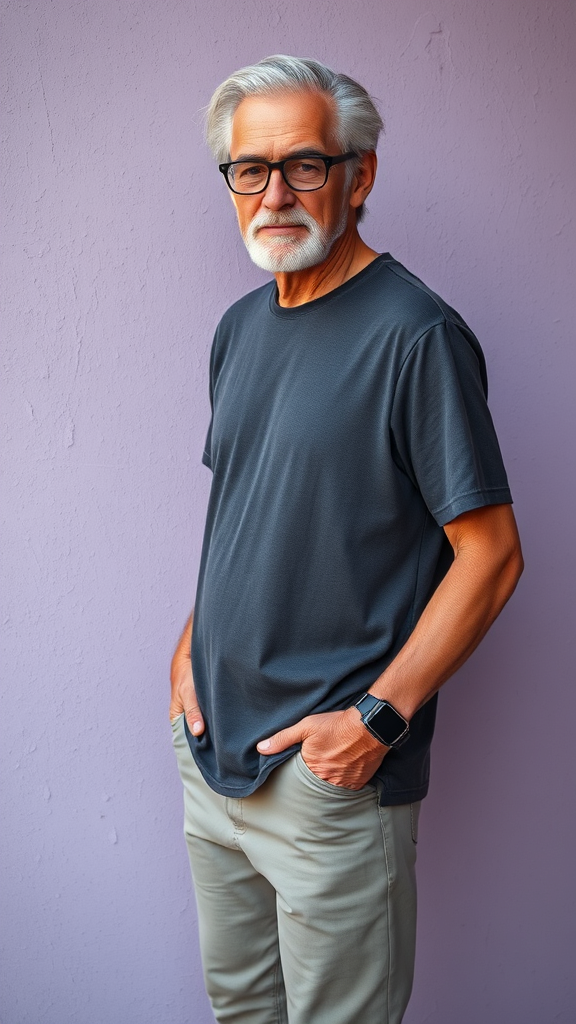 An older male model stands confidently against a textured rustic lilac wall, exuding wisdom and refined experience. He wears a monochromatic charcoal T-shirt, adorned with a small minimalist tattoo peeking out from beneath the sleeve, and a sleek, black Apple watch. His ensemble is completed by well-worn, black and white low-top sneakers that hint at a life well-traveled. His silver hair is stylishly swept back, adding a touch of sophistication, while black frame glasses emphasize his thoughtful demeanor. One hand casually rests in his pocket, projecting an image of aged elegance intertwined with urban street fashion. The composition is photorealistic and rich in detail, presenting a portrait of timeless grace and modern confidence.