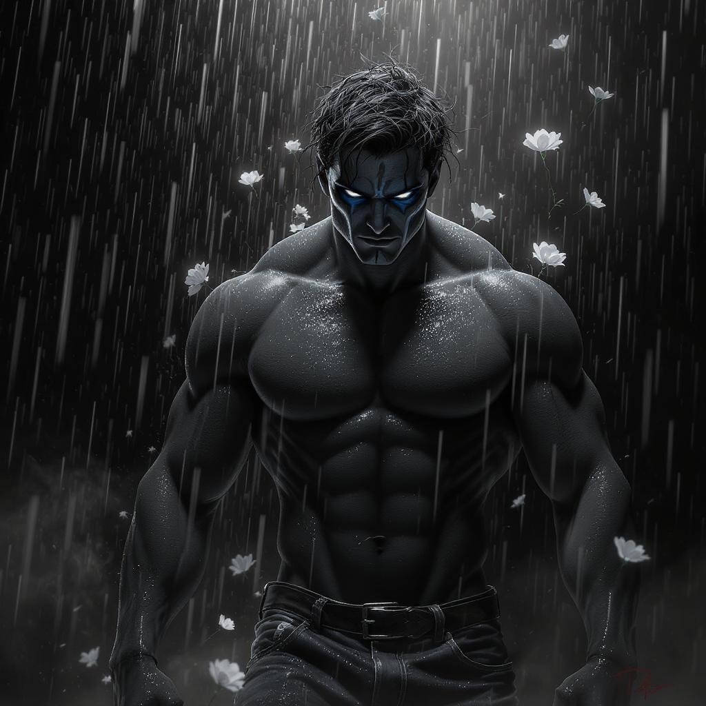 A breathtaking digital painting depicting the most beautiful artwork in the world, featuring a soft, lustrous male hero in an 8k unity render. Captured in an action shot, his skin pores are visible under very dark lighting with heavy shadows, creating an intricate and detailed face. The scene is decadent, set against heavy rain with particles floating in dim light, enhanced by trim light and two-tone lighting. The hero's face bears unique facial markings, and he is adorned in blue jeans. The illustration, art crafted in the styles of Artgerm, WLOP, Ilya Kuvshinov, Greg Rutkowski, and Alphonse Mucha, is smooth and sharply focused. It includes an ethereal flower adding to the atmosphere, with elements often found on ArtStation or in concept art. This creative rendition evokes a sense of timeless artistry, avoiding imperfections and maintaining a monochrome palette that enhances the overall mystique.