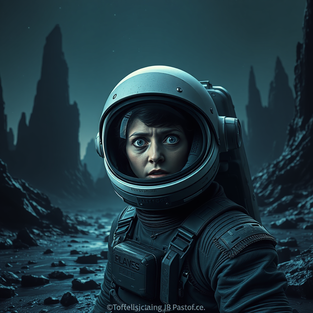 A terrified astronaut peers out from her helmet, eyes wide with fear, as a shadowy creature lurks behind her on a dimly lit alien planet. The landscape is shrouded in perpetual twilight, with towering, jagged rock formations and slick, moisture-laden surfaces reflecting the faint glow of distant stars. The air is heavy with an eerie silence, broken only by the astronaut's quickened breaths and the distant rustling of unseen creatures. The air smells metallic and ancient, hinting at secrets and dangers concealed within this otherworldly realm.