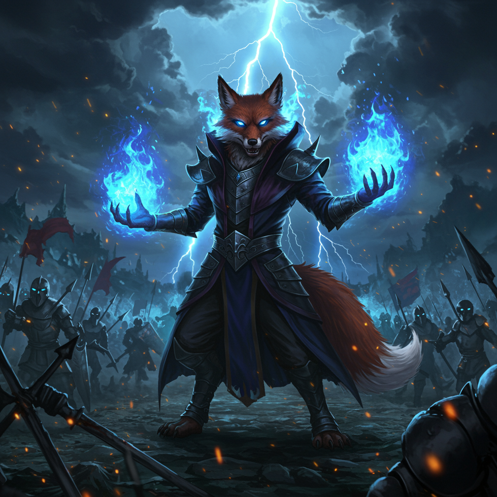 A formidable fox cloaked in shadows, exuding dark blue energy flames, stands as an anime-inspired sorcerer humanoid prince of darkness, dominating the battlefield. Surrounded by a vivid storm of blue infernal flames and flickering sparks, he commands the scene during an apocalyptic clash. The setting is colorful and intricately detailed, with hyper-realistic digital illustration capturing the elegance and power of this commanding figure. A dramatic thunderstorm looms overhead, its energy mirroring the chaos below, rendered in breathtaking 8K resolution.