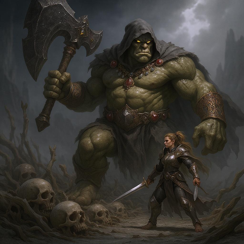 A hyper-realistic depiction of a DND character emerges: a towering hooded ogre with weathered green skin and piercing yellow eyes, gripping a colossal, cursed axe that seems to thrum with dark energy. Each of his formidable steps crushes ancient, brittle skeletons underfoot, their brittle remains telling tales of past, defeated foes. Adorning his massive wrists are ornate, golden bracelets etched with arcane symbols, while a bejeweled belt sparkles with deep crimson and azure gems, and a collection of necklaces with intricate patterns hang heavily from his neck, hinting at a history of conquest and plunder. Confronting this menacing figure stands a diminutive yet fiercely determined female warrior, her feet bare on the cold, rugged earth. She wears intricately crafted, gleaming armor that catches the flickering light, enhancing her aura of defiance and bravery. With her arms outstretched, she grips a finely honed sword in one hand and a swift dagger in the other, each weapon gleaming with readiness. Her eyes lock onto the ogre's, exuding unyielding confidence and a readiness for the battle ahead, setting the stage for a dramatic, cinematic clash of epic proportions.