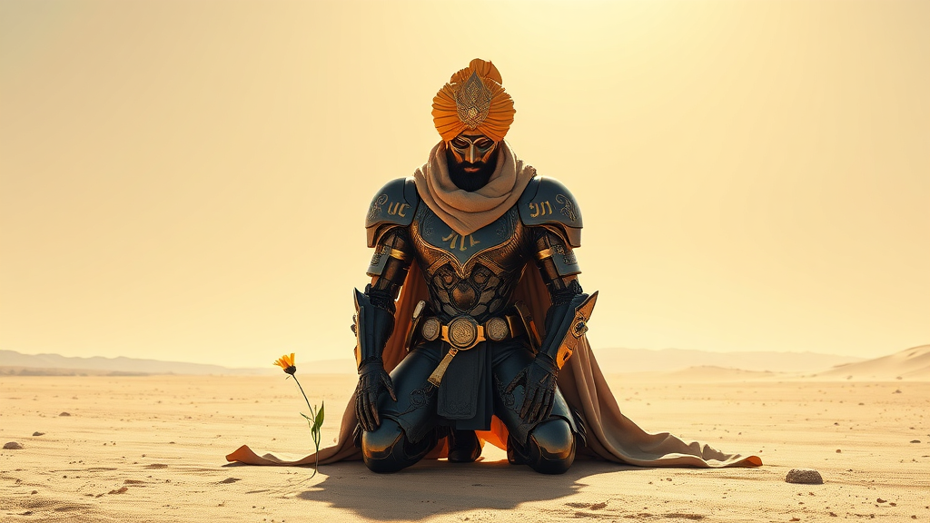 In a desolate desert under the bright daytime sun, a Sikh king kneels gracefully, draped in a long, heavy cape. He's adorned with a magnificent turban and a neo-futuristic Japanese mecha exoskeleton gundam suit. The suit, a marvel of carbon fiber technology, is intricately engraved with gold Punjabi letters, imbuing it with mystical powers. The king's face is concealed by a metal cover, exuding a blend of mystique and authority. Front and center, he reaches down to pick a solitary flower, a symbol of serenity amidst the barren landscape. The suit's design, reminiscent of Billelis art, combines elements of Akira and Star Wars with the romantic flair of Rembrandt's brushwork. The armor's surface is a mesmerizing tapestry of blink-and-miss details, echoing the works of Norman Rockwell, Syd Mead, and Boris Vallejo. This is a scene where modern history and neo-futuristic technology converge, playing out in a never-ending desert that stretches infinitely behind him. Each element captures the legendary cinematic style of Akira Kurosawa, with the precise detail of Jean Giraud Moebius, Eugéne Delacroix, and John Berkey, creating an artwork that is both timeless and forward-looking.