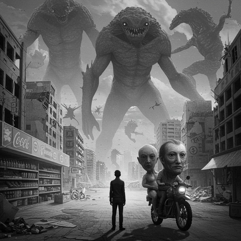 A lone figure stands in an ojou-sama pose amidst a city under siege by towering monsters, within a virtual reality world that feels all too real. The scene features shining fragments of ruins, reminiscent of a Vincent Joyal masterpiece. The environment shifts from a supermarket to a farmhouse interior, blending with a cityscape styled like the 1920s. Two faces, two individuals in conceptual draft form, ride a motorbike with ironman flair. Big heads with long beards and pointed footwear add eccentricity. The composition plays with surreal elements like fused fingers and two navels, as well as pointed shoes and heels. Despite challenges like blurry, disfigured anatomy, and mutation, the poster captures a sense of urgency and chaos. The old photo effect, paired with black and white tones, hints at a low-res, cartoonish quality, while avoiding text, logos, or watermarks. The result is a visually intriguing, imaginative exploration of a city caught between reality and fantasy.