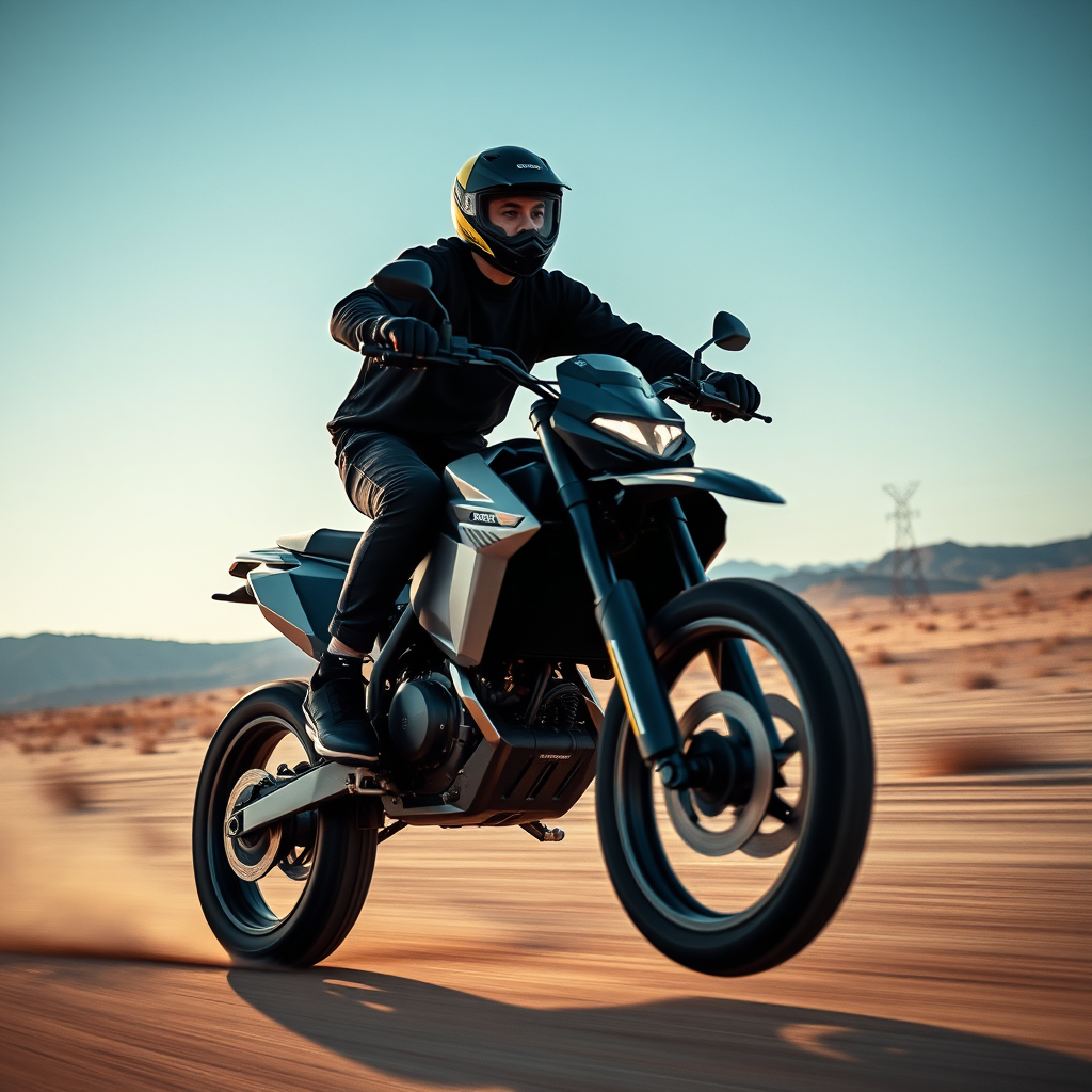 A young man riding an electric dirt bike across the desert landscape, dressed in sleek black clothing. The futuristic, battery-powered motorbike boasts an expensive carbon design. Capture the scene with a wide scenic shot, emphasizing low-angle perspective in a contemporary modernist photography style. The composition is dynamic, showcasing high speed and featuring a dramatic wheelie with motion blur, rendered in stunning 8k UHD. The atmospheric lighting enhances the moody ambiance, while professional color grading complements the dark blue sky filtered with a polarizing lens. Avoid vignetting or any elements of being cropped, mundane, or associating with traditional petrol engines.