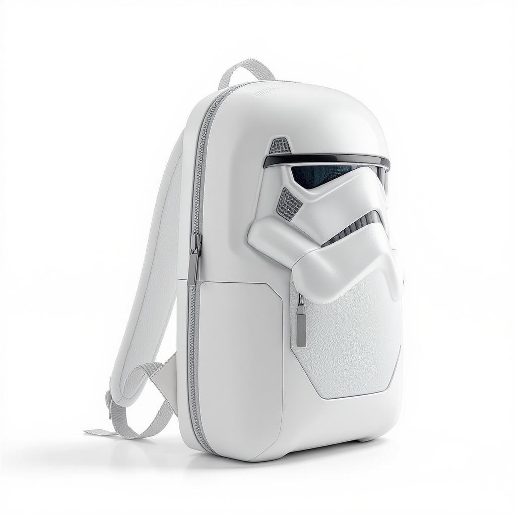 Futuristic white backpack in a sleek fullview hardcase capsule form, reminiscent of urban stormtrooper aesthetics, featuring a minimalist and clean product design. Rendered on a white background in high-resolution Octane 4K, showcasing intricate detailing and textured surfaces. Inspired by the design philosophy of Dieter Rams and Apple, the backpack embodies modern elegance with subtle creative nuances.