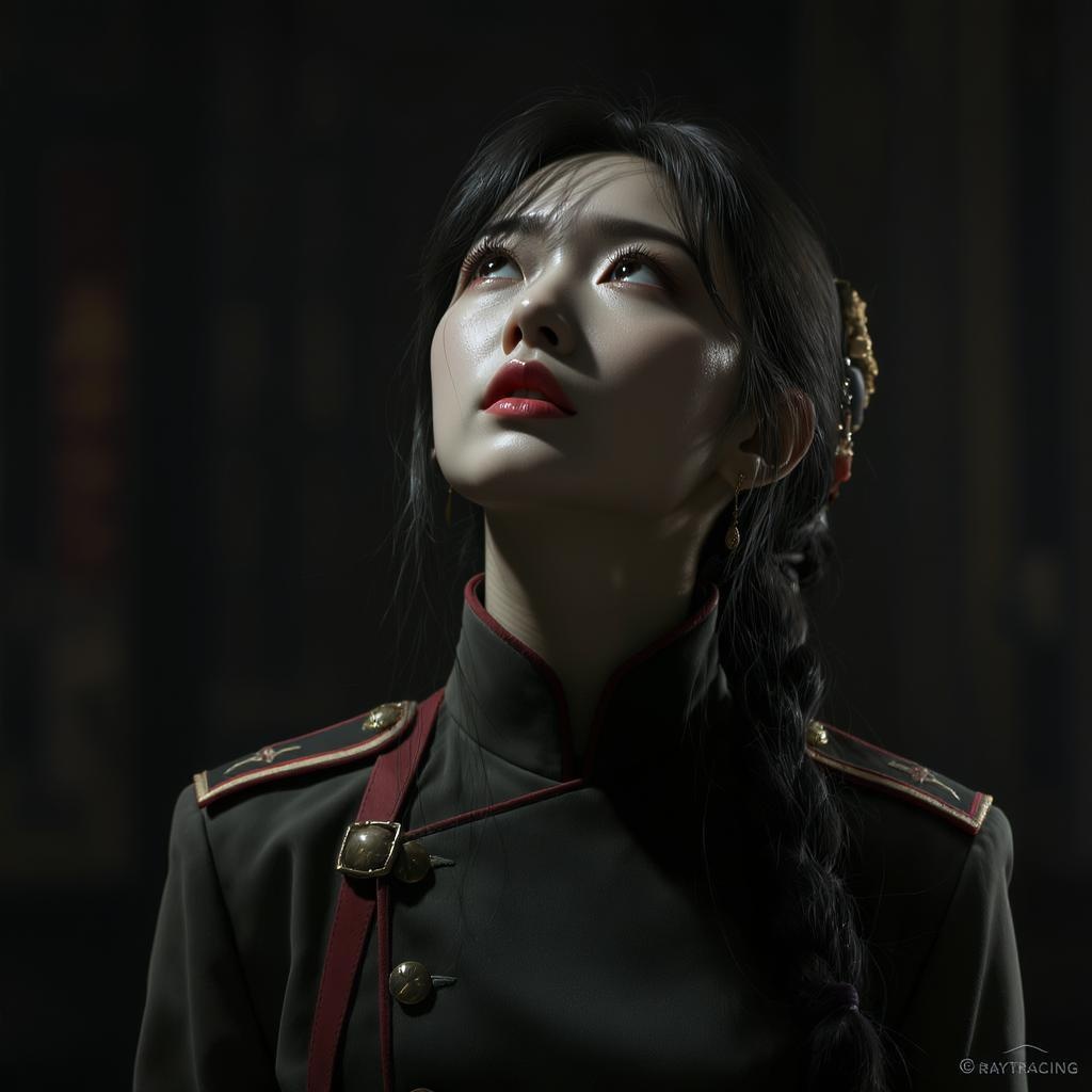 A striking young Chinese woman in elegant military uniform, her gaze directed upward with an expression of inquisitive wonder, indoors in a studio setting. The lighting is dramatic, casting intricate shadows that highlight her features. Concept art style with a touch of abstract realism, utilizing the capabilities of advanced graphics engines for a photorealistic effect, enhanced by ray tracing technology that captures every detail. The scene combines a balance of realism with artistic interpretation, giving it a timeless and captivating quality.