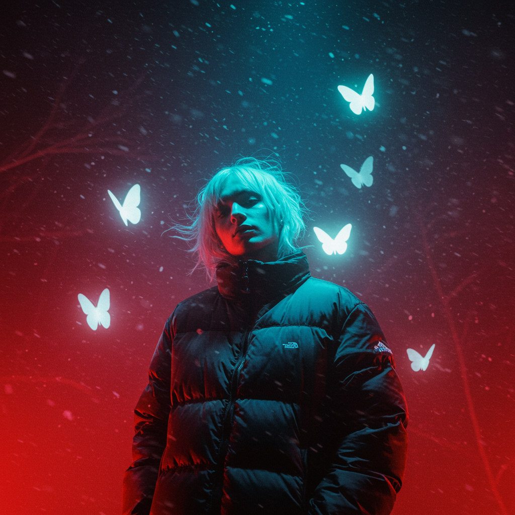 A hazy image captures the essence of snowy winter fashion featuring an androgynous figure in a sleek puffer jacket against a surreal night sky. The shades of crimson and azure swirl like a dance of change and wind. Softly glowing, realistic butterflies weave through a shadowy forest, casting an ethereal light. This minimalist scene exudes cosmopolitan energy with serene expressions and a flowing, fluid form. The palette is cool, with hints of light black, encapsulating both beauty and mystery, evoking abstract dreams amidst an ordered chaos under an imaginative 2:3 ratio.