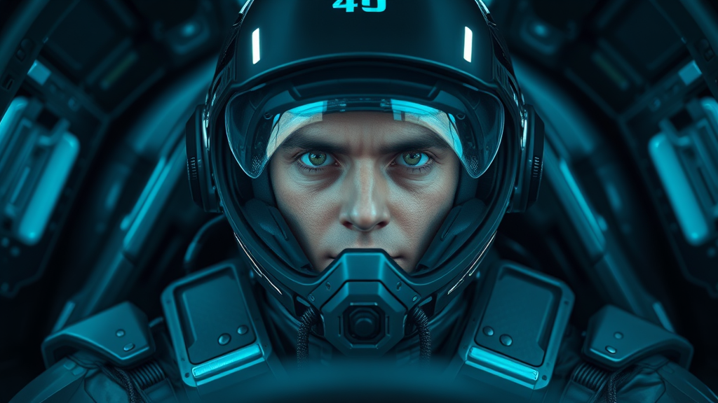 A hyperrealistic and intricately detailed portrait of a pilot wearing a futuristic helmet with full-face coverage, seated in a high-tech cockpit, clad in sci-fi armor, and gazing directly at the viewer. The scene embodies a cyberpunk aesthetic with bioluminescent accents illuminating the environment. The composition is centered and presented in cinematic style, showcasing sharp focus and an engaging depth of field. The lighting enhances the futuristic atmosphere, emphasizing the pilot’s enigmatic presence.