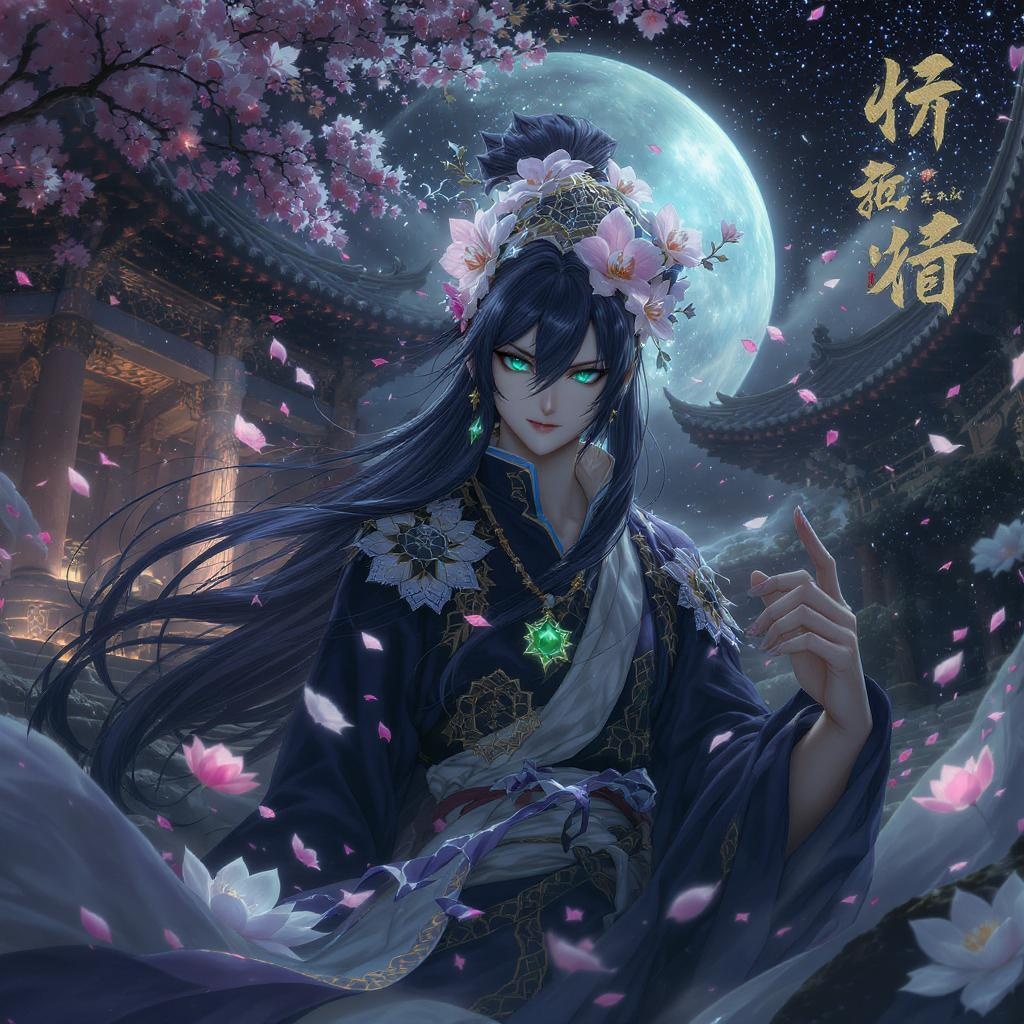 A mysterious anime sorcerer from the Tang dynasty, adorned with an orchid hair accessory and a jade charm, stands poised at midnight within the haunting grandeur of an ancient temple. Their emerald green eyes gleam with an otherworldly wisdom, contrasting with midnight blue hair that cascades like the night sky. A celestial star ornament twinkles in their hair, enhancing the mystical atmosphere of a breathtaking landscape. In the enchanting style of Kay Nielsen, their flowing robes whisper secrets of the past, as they gaze intently into the camera in a wide-angle portrait. The scene is illuminated with mystical lighting that dances like a thousand constellations across the temple's features. Orchid blossoms surround them, scattered like magical sparks in a visionary display. This mixed media rendering captures the enchanting essence, adding a touch of floating lotus petals and delicate wisps of ancient calligraphy that weave through the scene like a timeless incantation.