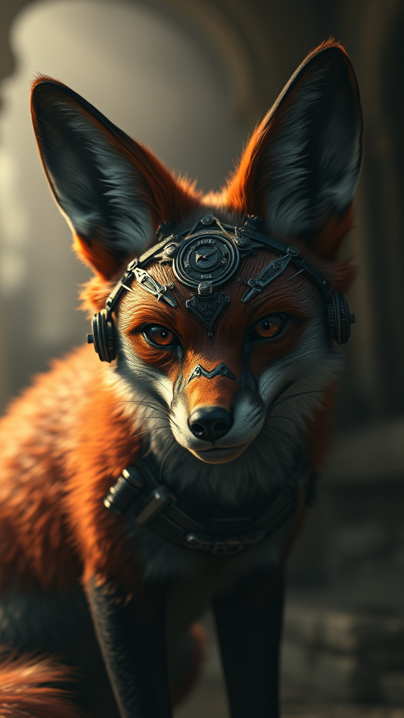 A steampunk crimson fox with intricate mechanical features, set against a distant backdrop of atmospheric gothic horror, evoking a Lovecraftian sense of unease. The scene is crafted with Unreal Engine, featuring hyper-realistic details through ray tracing technology. The setting is enveloped in very dark lighting with heavy shadows, capturing a sense of mystery. The composition is wide-angle, blending digital art with realistic painting techniques, reminiscent of DnD narratives. It trends on ArtStation, utilizing soft, natural ambient lighting to contrast with dramatic shadows and photorealistic qualities. The fox is portrayed with excessive detailing, intricate patterns, and a sharply focused visage. Volumetric lighting enhances the cinematic aura, presenting a magical and haunting visual narrative.