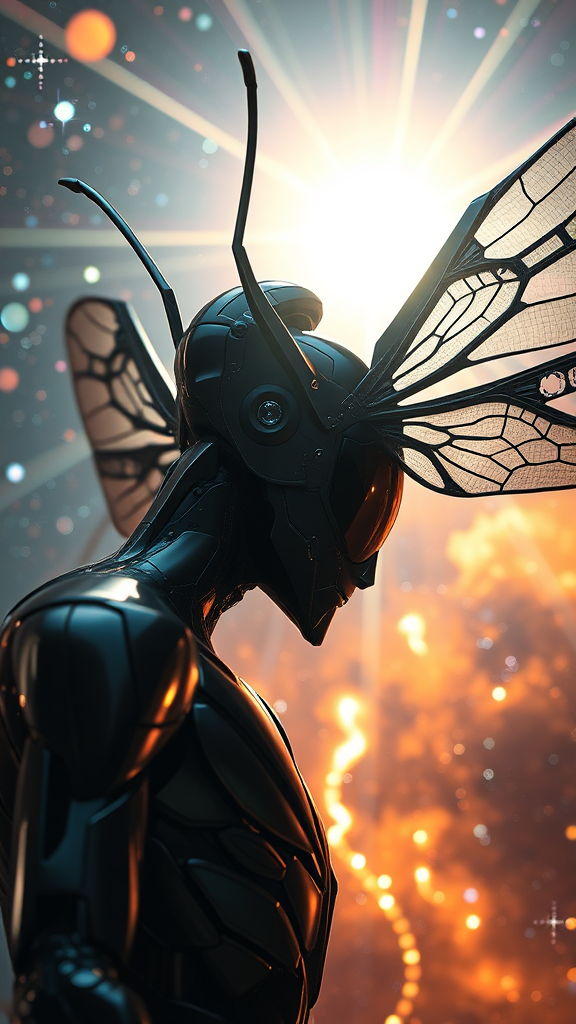 A detailed portrait close-up of a slender, streamlined Sci-fi mech with a glossy black and highly reflective surface, crafted with an insectoid design featuring intricate Sci-fi wings. The figure is presented in three-quarter view, drawing inspiration from the styles of Tsutomu Nihei and Akira. Set against a dramatic outer space backdrop illuminated by a bright quasar, with cosmic starlight and galaxy hues interwoven with vibrant plasma rays. Executed with the finesse of 8k UHD hyper-realistic anime art and manga drawing, as though captured by a Hasselblad H4D 200MS digital camera equipped with a Mitakon Speedmaster 65mm f/1 lens, resulting in vivid three-dimensional graphics that evoke a sense of awe and wonder.