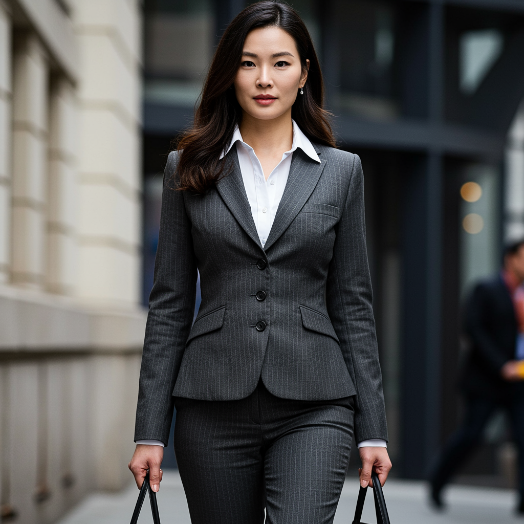 As the observer takes in the image, they're immediately struck by the compelling presence of the quintessential female business leader. She is impeccably clad in a sharp, tailored suit that highlights her curves, radiating both confidence and authority. The suit's fabric, a luxurious blend of wool and silk, features a subtle pinstripe pattern, adding a layer of sophistication to her attire. The jacket fits flawlessly, with a sleek lapel and three buttons that accentuate her svelte waistline, embodying elegance and power.