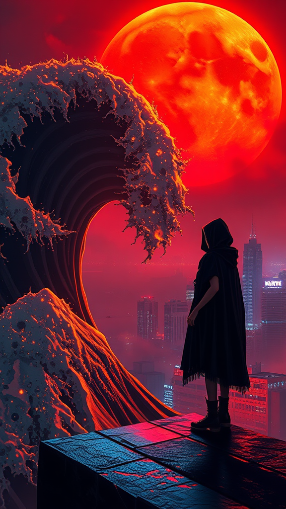Masterpiece best quality, a radiant golden wave crashing under a vivid orange sunset seeping through the shimmering crest, glimmering with golden droplets, a lone female figure poised on a ledge surveying a neon-lit cityscape plunged in darkness, urban fantasy flair in every detail. Clad in a shadowy cybernetic cloak reminiscent of a Sith Lord, bathed in the scarlet glow of a looming blood moon, she embodies the essence of cyberpunk anime—a futuristic guardian veiled under a hooded science fiction cape. The digital canvas bursts with dark, edgy cyberpunk themes, the sky a tapestry of rifts and fractures, exposing a surreal landscape beneath the fissures. Each element boasts hyper-realistic material clarity, elevated by the capabilities of Unreal Engine 5, yielding a composition of intense drama and realism. Concept art in its prime, rendered with meticulous precision, showcases a universe where technology and fantasy convergently thrive against a backdrop of a broken yet mesmerizing sky.