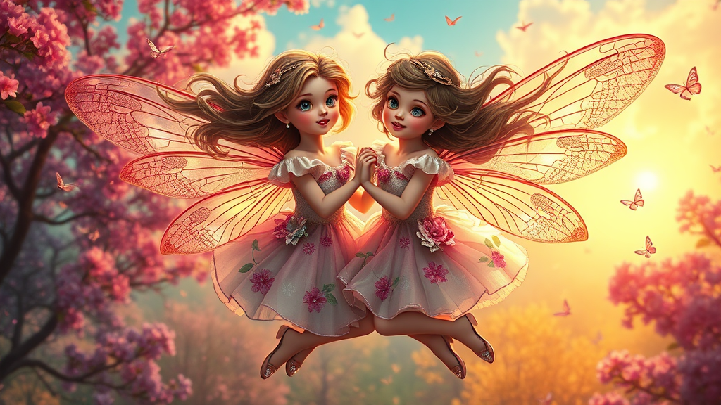 Two enchanting faerie girls soaring joyfully through a vibrant, fantasy-lit forest, embracing with expressions of hope and affection. Their petite figures are adorned in exquisite, off-the-shoulder floral faerie dresses with stunningly detailed, intricate patterns. Their fluffy, windswept hair is interspersed with stray strands, complementing their glamorous symmetrical dragonfly wings. Each detail of their appearance, from their diamond heels to their exquisitely detailed faces, glossed lips, and mesmerizing eyes, reflects the highest craftsmanship. The scene captures the essence of a magical, colorful sky where glowing, shimmering sunlight dances around them. Tiny, hyper-detailed butterflies flutter throughout the air, adding to the fantastical ambiance. The image boasts vibrant, cinematic lighting with volumetric effects, capturing a cozy and nostalgic mood reminiscent of award-winning photography. Rendered in maximalist, high-resolution detail, each line and color speaks to the richness and depth of this visually stunning masterpiece. Panoramic and ultra-expressive, this spectacular, vintage-inspired fantasy scene is a testament to the artistry of masterful visual storytelling.