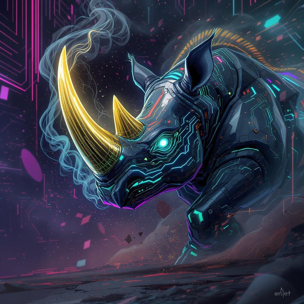 A dynamic electronic rhinoceros adorned with radiant eyes and a luminous, golden horn, set against a vivid esport backdrop. Wisps of smoke elegantly curl from its nostrils, adding an aura of mystery. The design is sleek and modern, with hints of neon accents to enhance its digital essence, and the background bursts with energetic patterns and colors, injecting chaos into the scene while maintaining a harmonious composition.