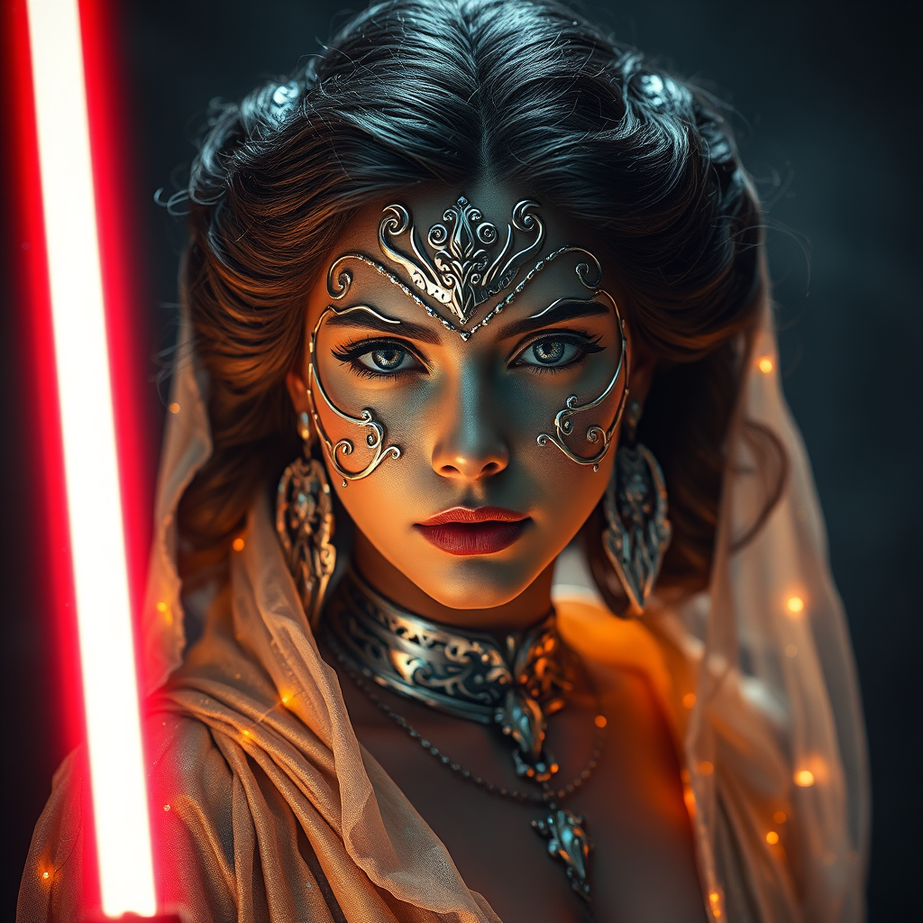 Princess Leia enveloped in a magical nightly glow, adorned with intricate silver features reflecting a mysterious beam, set in a dark fantasy world reminiscent of Luis Royo’s artistry, captured in a studio portrait style with a cyberpunk twist. Rendered in 8K UHD HDR for stunning clarity, avoiding low resolution pitfalls, immersive and captivating, free of distractions like out-of-frame elements, blurriness, or image artifacts.