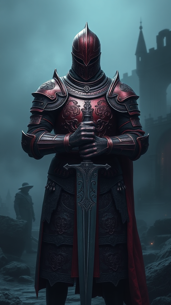 A digital art drawing of a medieval knight standing poised with a one-handed sword in front of him, clad in intricately detailed armor that glimmers in shades of deep red and rich purple, evoking a sense of nobility and prowess. The armor, ornately engraved with motifs of mythical creatures, reflects a digital realism akin to the aesthetic of Dark Souls, with layers and textures that suggest a history of battles. The background is an eerie, dark medieval landscape shrouded in mist, capturing the essence of darkcore with looming shadows and hints of ancient ruins. The atmosphere is cinematic, further enhanced by a subtle, foreboding fog that blankets the environment. The composition is set for a 4k wallpaper, rendered in stunning 8k resolution, immersing the viewer in a world where every detail, from the intricate designs on the armor to the atmospheric backdrop, comes together to tell the story of a lone warrior in a dark and mysterious realm.
