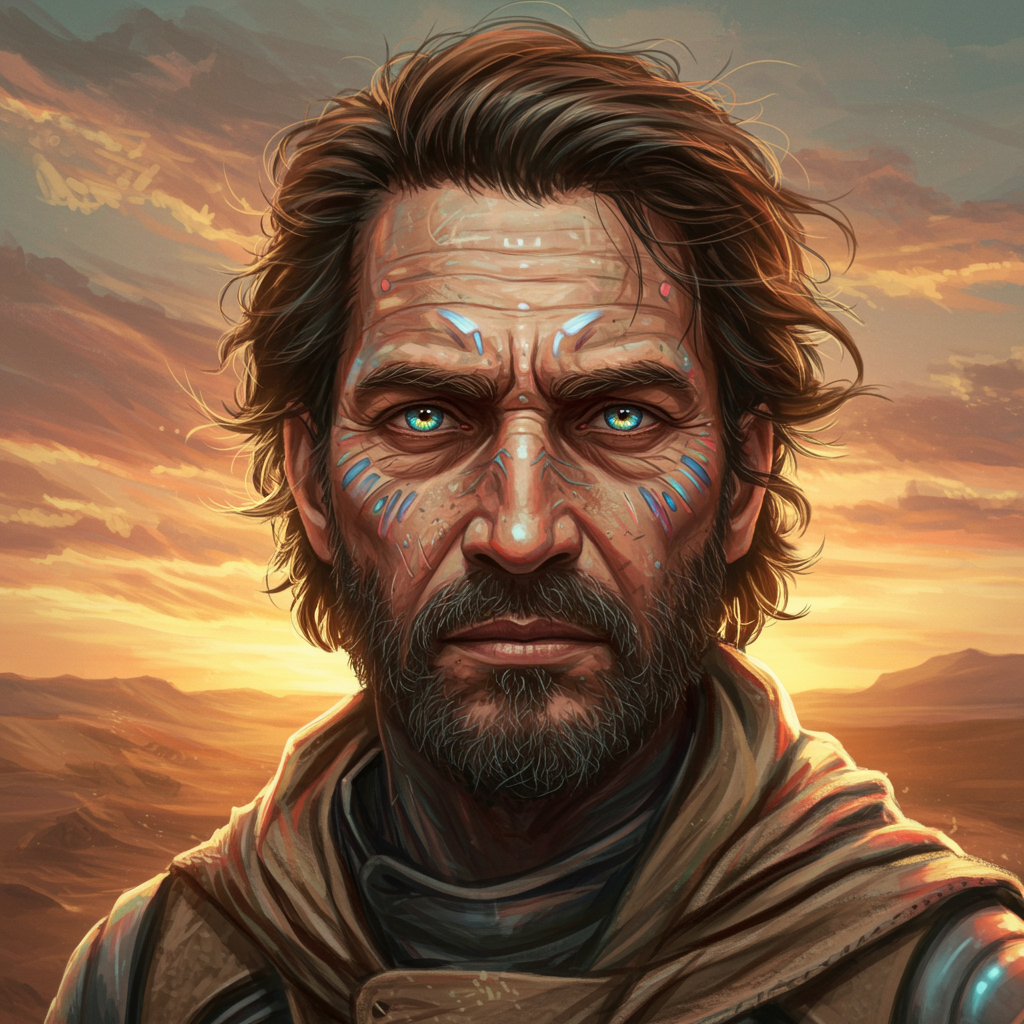 An ultra-detailed and beautifully painted psychedelic portrait of a rugged male character inspired by Dune, centered and intricate, with a blend of artistic styles by Conrad Roset, Greg Rutkowski, and Makoto Shinkai. The composition showcases a windswept desert landscape in the background, shimmering under a surreal sunset. The character's piercing eyes hold a deep wisdom, reflecting the hues of a psychedelic color palette. His expression is both stern and contemplative, surrounded by ethereal patterns that dance around him. Textures and lighting contribute to a realistic yet cinematic feel, with intricate details in the clothing and skin reminiscent of windswept signifiers of the desert. This artwork captures the complexity and mystique of the Dune universe, exuding a sense of adventure and depth, perfect for trending on ArtStation.