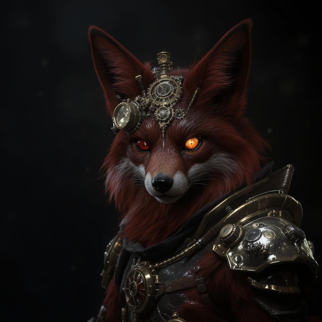 A steampunk-inspired red fox, with Lovecraftian horror elements, rendered in a hyper-realistic style using Unreal Engine and advanced ray tracing techniques. The scene features dark, moody lighting with heavy shadows and intricate details, capturing the essence of a digital art piece reminiscent of a realistic painting. Set in a wide-angle view, this character design is perfect for a DnD campaign, showcasing its trending popularity on ArtStation. The composition blends soft, natural lighting with magic photography effects and dramatic, cinematic illumination, achieving photorealism with excessive detailing. The fox is depicted in a portrait-style, emphasizing its sharp focus and intricate design. Volumetric lighting enhances the atmosphere, creating a smooth, sharp focus that captivates the viewer's imagination and highlights the character's steampunk charm and dark mystique.