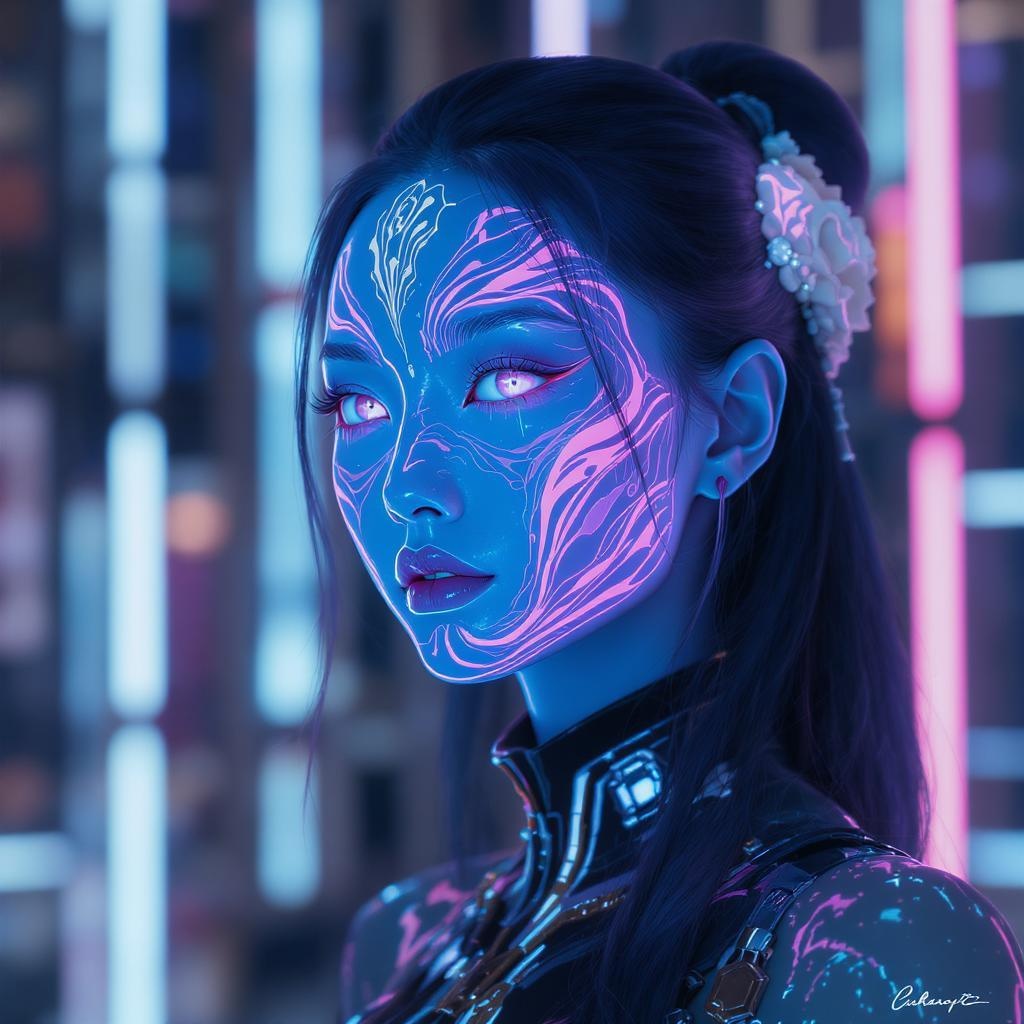 A three-quarter portrait of a blue-skinned figure with a translucent, glowing pink face adorned with delicate fluid patterns, set against a backdrop of ethereal lights. The design showcases a futuristic sci-fi aesthetic with hyper-realistic detail, blending Asian-inspired elements with a modern twist. The scene is illuminated with soft white and pastel pink hues, creating a glossy, almost liquid sheen. The portrait exudes photorealistic precision, capturing every minute detail with aurorapunk influences, embodying an otherworldly and yet intimately familiar essence.