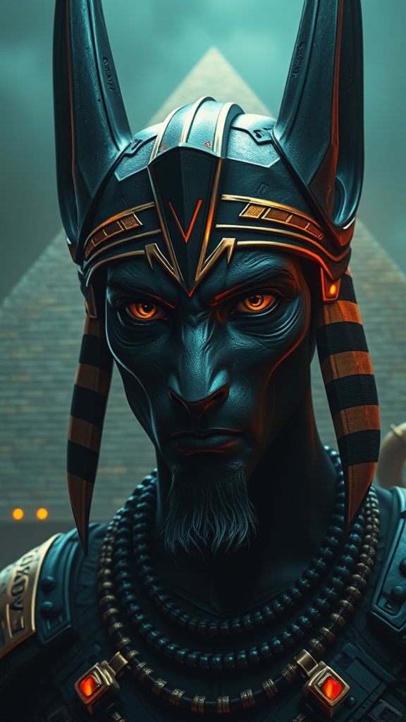 Portrait of an Egyptian male Anubis, cyberpunk style, dark-skinned with a pyramid backdrop, featuring hyperdetailed and expressive eyes. The piece is a hyperrealistic, extremely detailed masterwork in the realm of dark fantasy. It resembles a detailed matte painting, influenced by Greg Rutkowski, with 8k resolution concept art quality. The splash art is intricately detailed and trending on Artstation, characterized by dynamic lighting, with an Eldritch and hyperdetailed quality. The figure is depicted with an epic and mysterious aura, incorporating the essence of Anubis while being set in a cyberpunk landscape. The overall composition avoids unrealistic anatomy, blurry elements, and low-quality features, focusing on a clear and well-defined appearance, ensuring a compelling and captivating visual without any visual flaws or negative characteristics.
