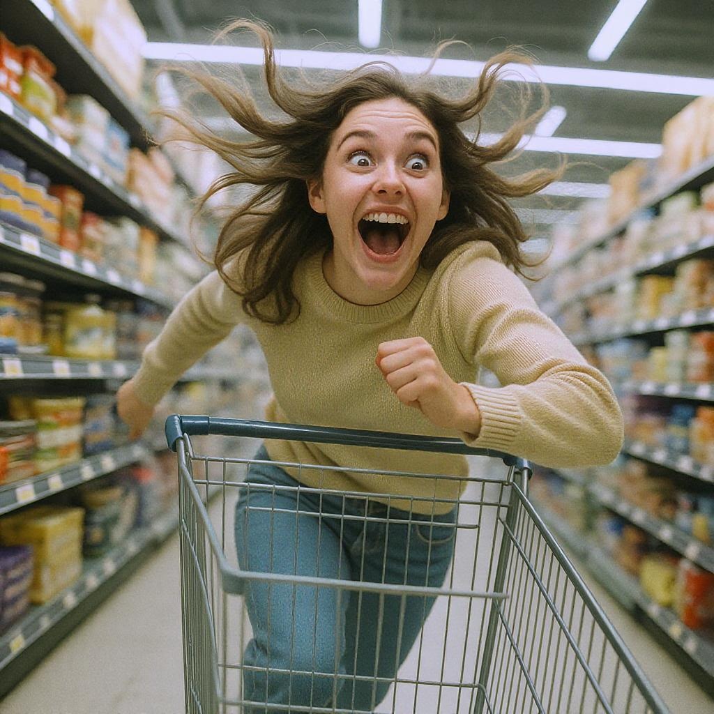 A woman dashes down a supermarket aisle, pushing a shopping cart, her hair flowing wildly behind her. The scene captures a whirlwind of playful chaos, blending photo-realistic details with hyperbolic flair. Her expression is an exaggerated mix of excitement and determination, eyes wide and mouth open in a gleeful whoop. The low-angle perspective amplifies the motion, with products and packaging blurring in the background as if swept by a gust of wind. The image evokes the artistic touch of Zhang Jingna and Yasuo Kuniyoshi, with a hint of Jessica Drossin’s dreamy yet dynamic style, creating a vibrant narrative of whimsical urgency.