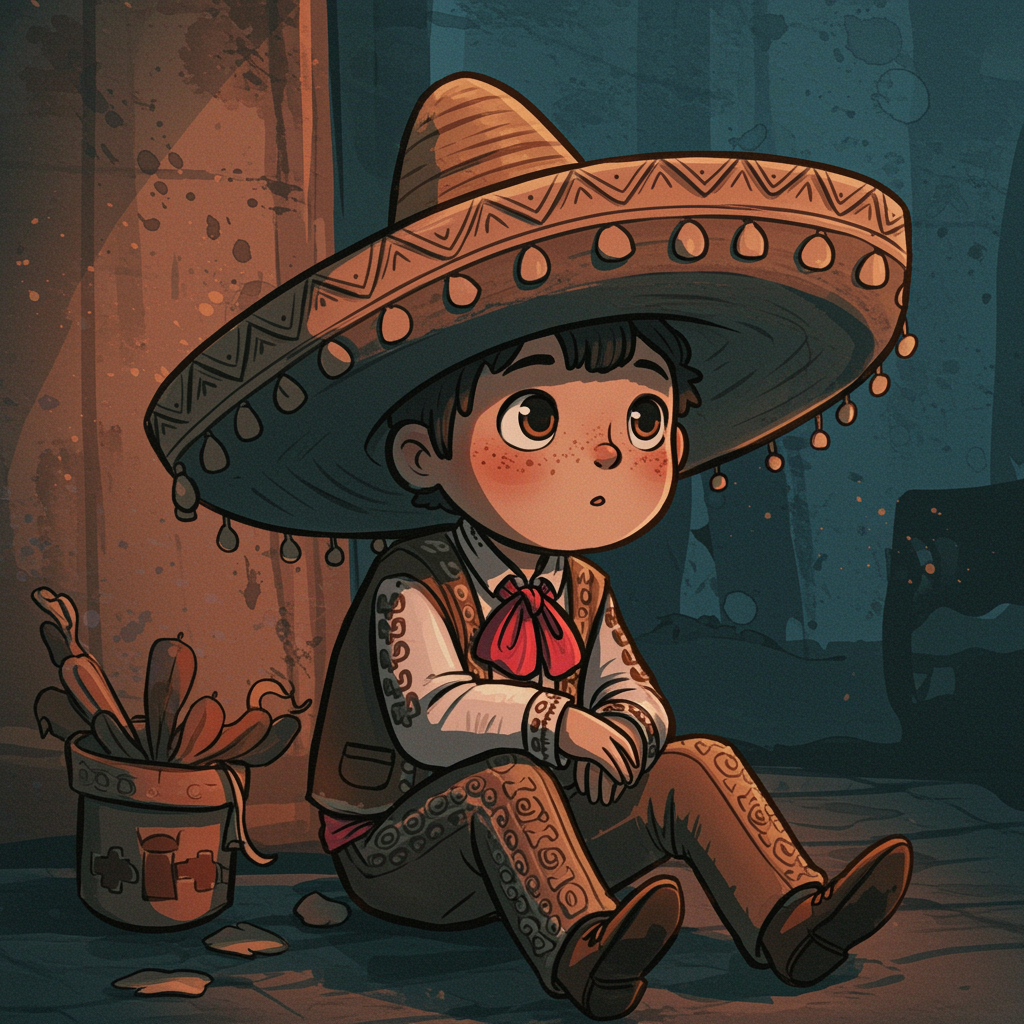 A cartoon boy with a broad, colorful sombrero sits in a scene rendered with detailed comic book artistry, painted in shades of dark cyan and bronze. The illustration features expressive stains and washes that bring the image to life, capturing a sense of child-like innocence. His costume is intricately detailed, showcasing cultural motifs with both respect and whimsy, exuding a playful yet artistic feel. The background subtly incorporates abstract patterns that mimic classic comic textures, while the boy's wide, curious eyes reflect a world of imagination and exploration.