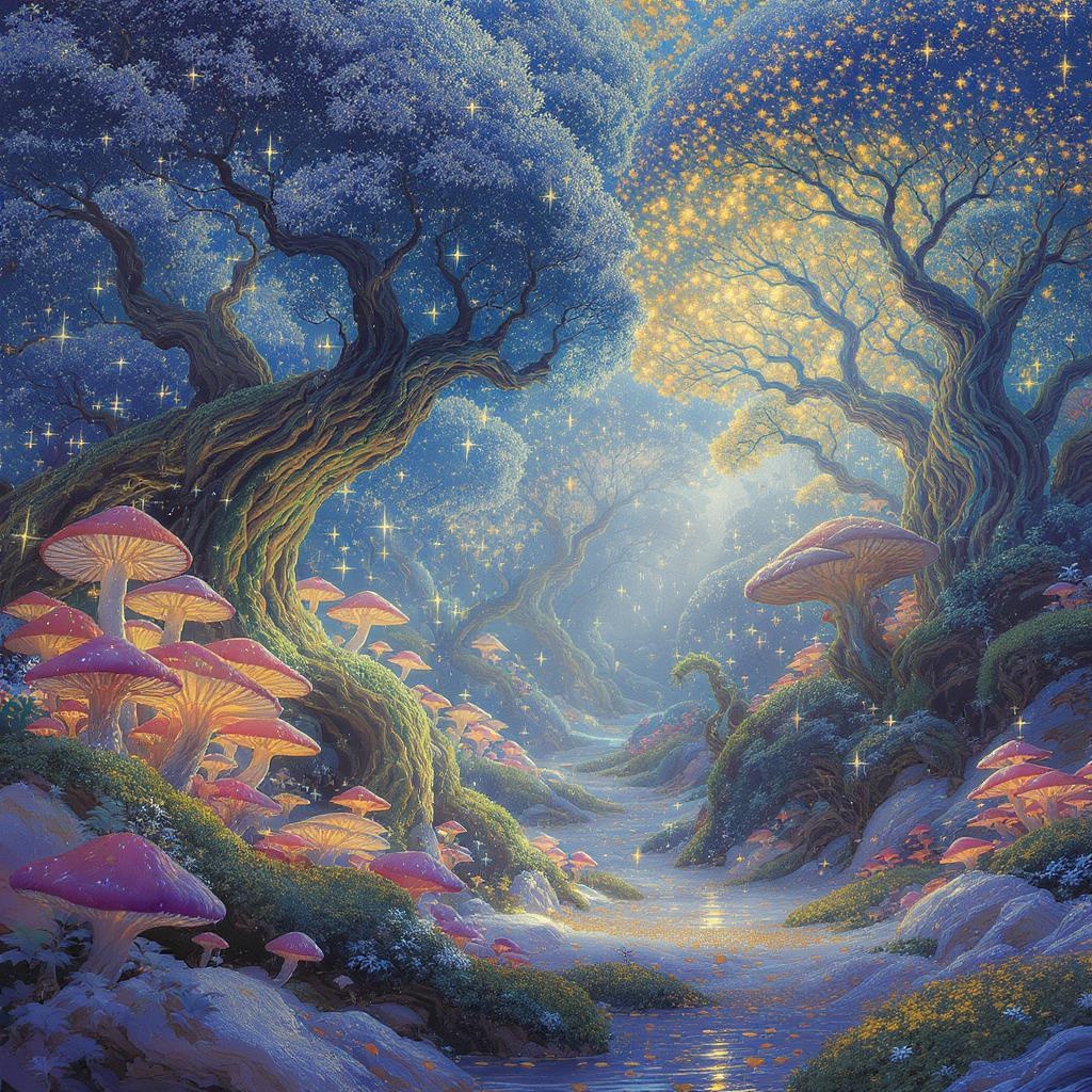 Enchanted Fantasy, Exquisite masterpiece, illustration of a mythical woodland, ethereal glow, vibrant palette, mushroom-shaped flora, soft illumination, intricately detailed, rendered in advanced graphics, reminiscent of Van Gogh's style, Ultra High Definition, High Dynamic Range, 16K resolution. Avoid: compression artifacts, poor resolution, extraneous text, branding elements, lettering, blurriness, incomplete composition, replication, low-quality visuals, framed elements, and redundant imagery.