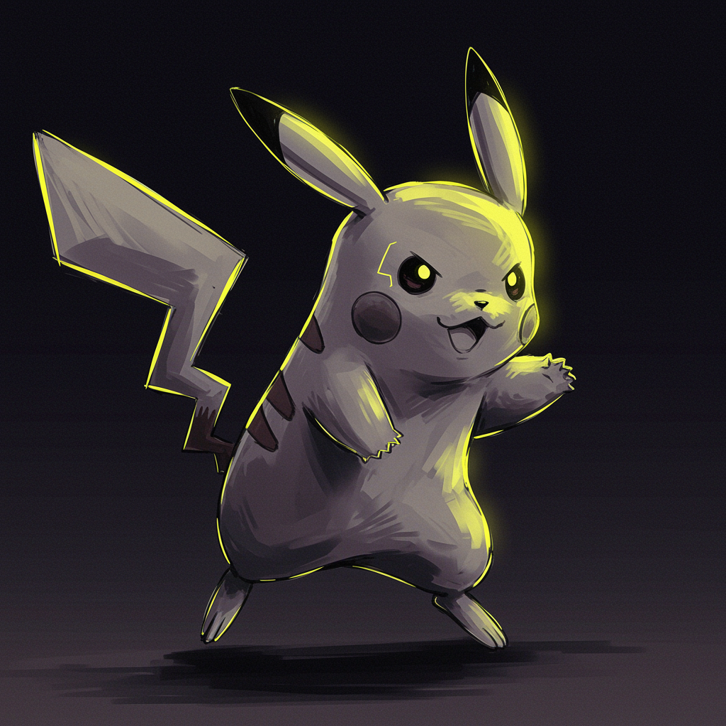Pikachu in a dynamic action pose, evoking anime style with sketch-like elements, infused with nvinkpunk aesthetics; abstract brush strokes and heavy lines define the form, rendered in HDR Neo-Noir style with vibrant neon yellow highlights, embodying a minimalist yet striking visual impact.
