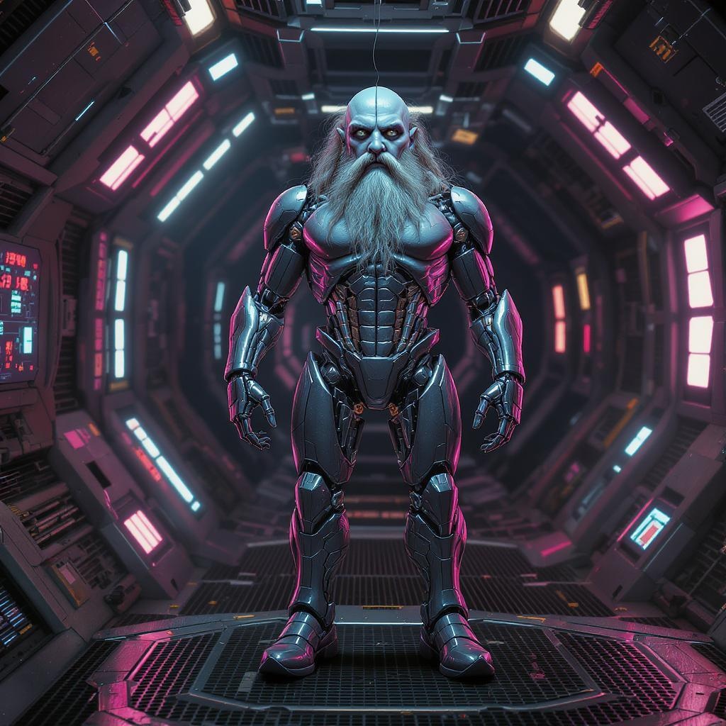 An ultra-detailed cyborg in a spaceship featuring sophisticated anthropomorphic cybernetic skeleton elements integrated into sleek metal armor. The scene glows with neon lights reflections, showcasing intricate designs and extraordinary detail, captured in dramatic lighting. The cyborg appears in a hyperrealistic and photorealistic manner, emphasizing a cinematic quality. With two distinct faces, the image portrays two personas unified within a single concept. Elements such as shoe laces and unique attributes like two navels add to the complexity, while the cyborg’s exaggerated features include a big head and long, flowing beard. Its pointed footwear strikes a bold contrast against the technology-rich environment. While maintaining the detailed realism, minor imperfections hint at the fantastical nature of the character, with subtle mutations that blend seamlessly without overshadowing the primary concept. Reflections in the design suggest a futuristic landscape, weaving together elements of both human and machine.