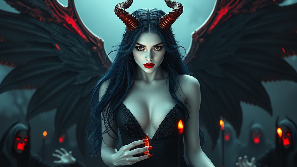 Majestic and ethereal, the captivating woman possesses flawless, luminous white skin; her lips painted a striking scarlet, contrasting with cascading midnight blue hair. Her intense, deep crimson eyes are both enchanting and formidable, embodying the essence of a queen vampiress. Jet-red horns crown her head, and from her back extend six magnificent arching wings, creating a powerful, regal silhouette. Lesser vampires kneel in reverence at her feet in a dark, morbid, and gothic realm. The scene exudes an otherworldly, dense atmosphere, drenched in dramatic tension, where every detail glistens with wetness and sweat. A hyperornate and elaborate setting surrounds her, evoking a sense of creepy grandeur. The femme fatale's glamour radiates in an epic shot that captures her passionate essence in extraordinary detail. The landscape is masterfully detailed, with photorealistic elements and volumetric lighting achieved through an octane render in Unreal Engine 5, embodying hypermaximalist artistry in a full body shot.